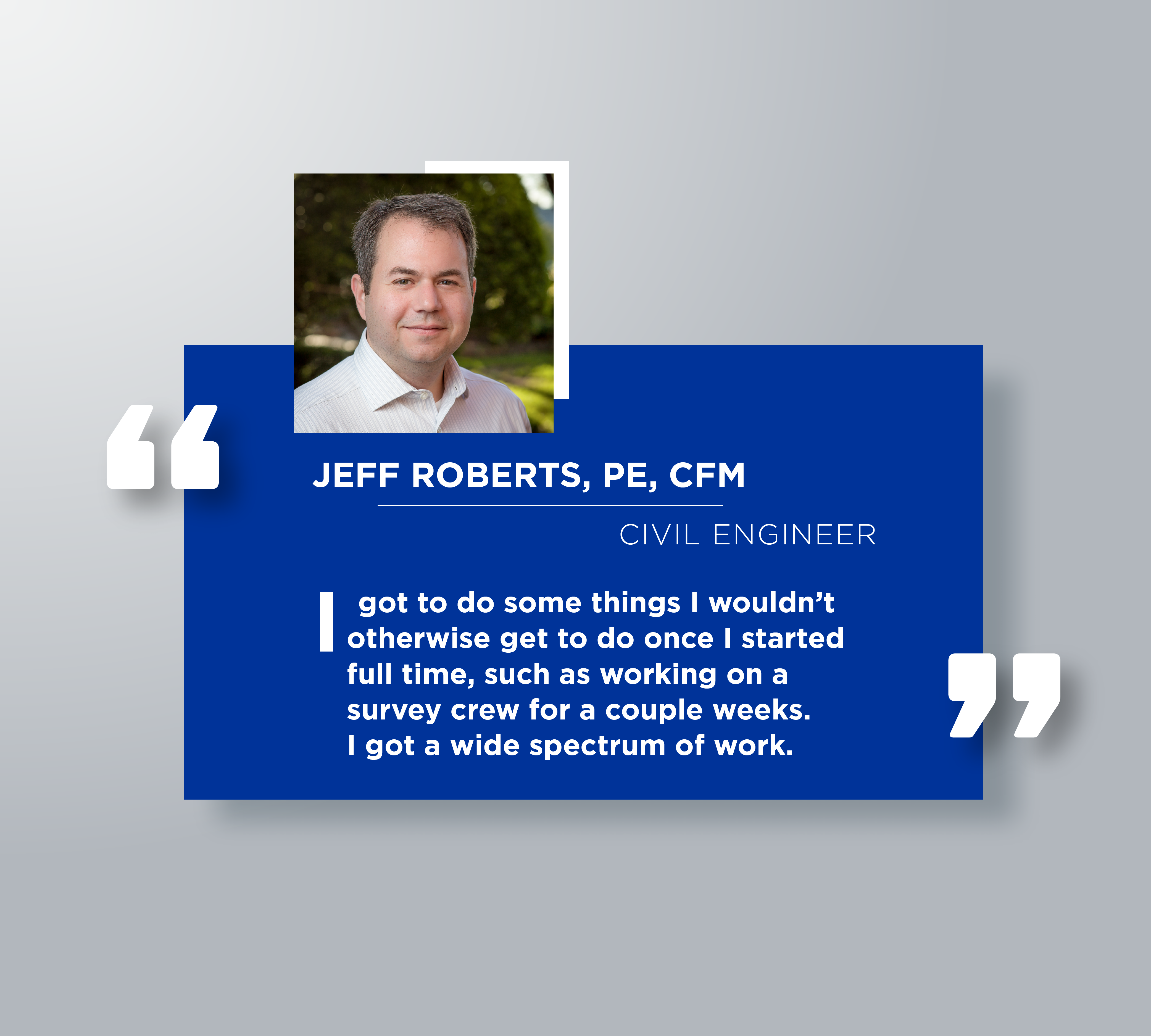 Civil Engineer Jeff Roberts, who was hired at Halff in 2003 following his internship, said he “learned that some things they stress in class really aren’t applicable, and then there are other things that aren’t really stressed that are applicable.”